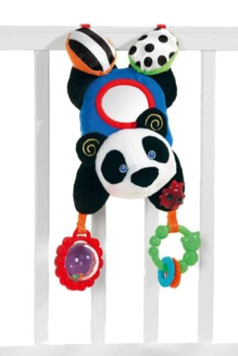Parents can take this On-the-Go Musical Panda wherever their baby goes. Designed to stimulate your infant's sense of sight, sound and touch, this soft plush panda bear features black and white patterned feet, a big mirror, crinkly ears and a squeaker paw. In one paw it holds a spinning rattle ball; in the other an inchworm pull with clackers.